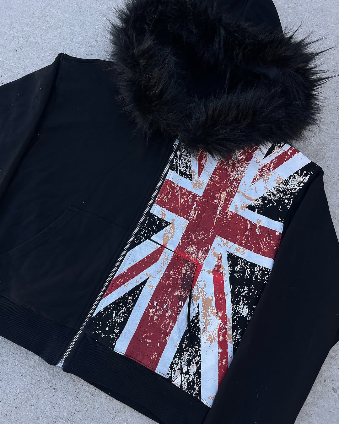 Fur Collar Printed Zipper Sweater Long Sleeve Pullover Hoodie Vintage Coat