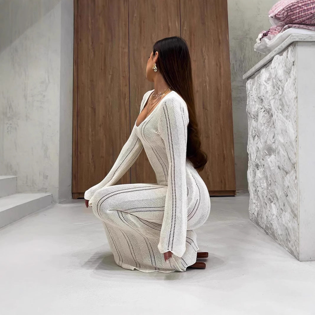 Women's Fashion Elegant V-Neck Knitted Dress With Flared Sleeves, Thin Hollow Out Bodycon Maxi Dress